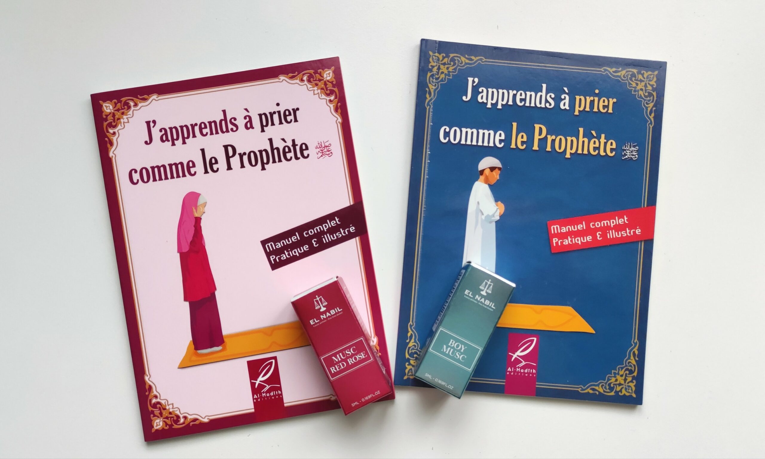 Pack Duo : 2 Livres « J’apprends à prier comme le Prophète » (version fille & garçon) avec 1 Musc Girl (ou Red Rose) & Boy El Nabil (5ml) .